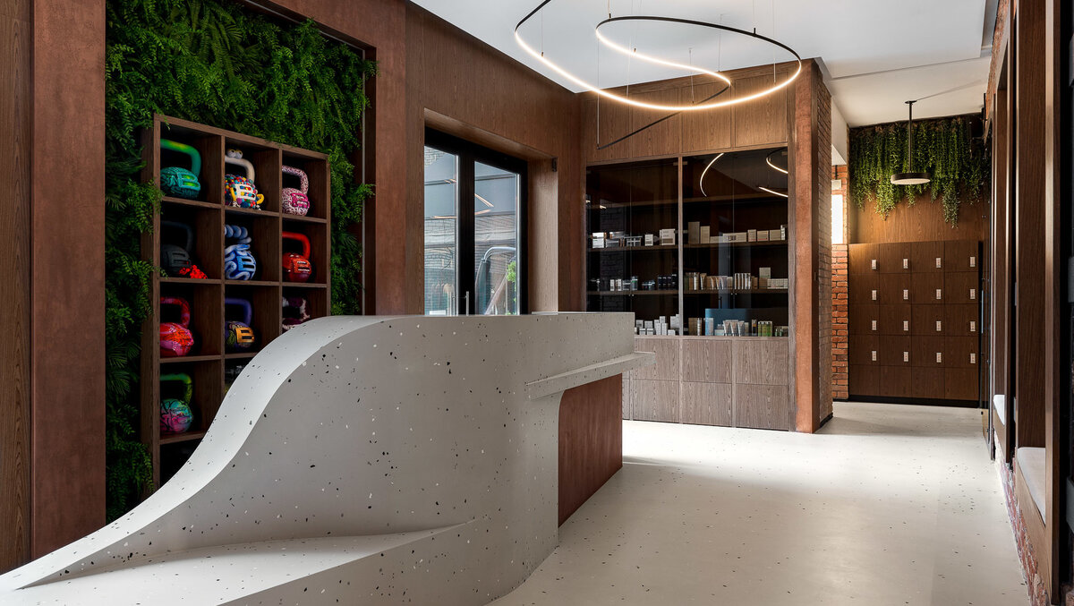 В зоне ресепшен все внимание к себе притягивает изогнутая стойка, дополненная световой инсталляцией. За ней расположен стеллаж с арт-объектами — яркими гирями, каждую из которых создавал отдельный художник.