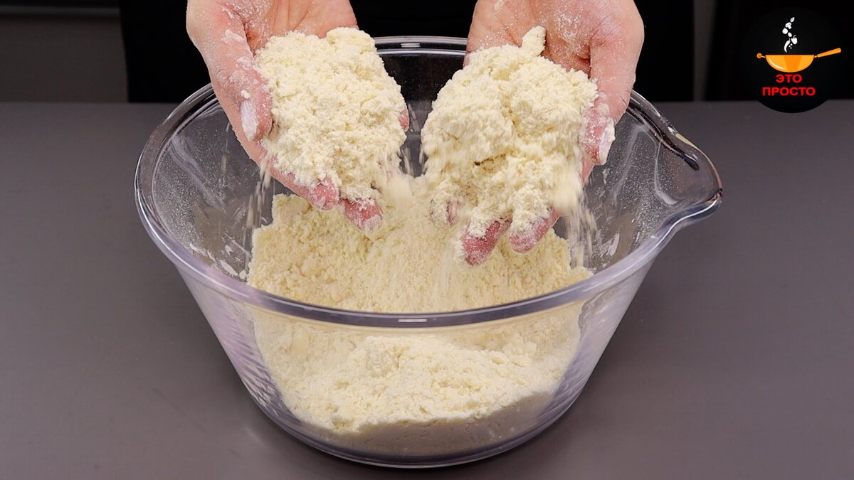 В муку натираем холодное сливочное масло и перетираем их вместе в мелкую крошку.
