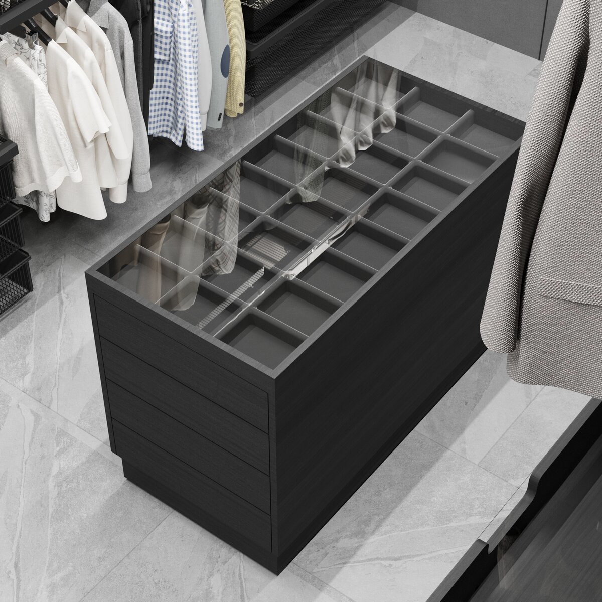 Для чего нужна гардеробная комната? Во-первых, для того, чтобы одежда, обувь и другие вещи всегда были в порядке, имели отличный внешний вид. Во-вторых, когда гардеробная правильно организованна и вещи на своих местах, то в доме значительно больше свободного пространства, появляется легкость, воздух… В-третьих, гардеробная – это экономия времени. При правильно организованной гардеробной, найти нужную вещь не составит труда. Давайте, разбираться, какая она – идеальная гардеробная. Планировка гардеробной. Пространство гардеробной должно быть удобным и функциональным, где каждая вещь лежит на своем месте. Если позволяет площадь комнаты, идеально по периметру разместить секции со штангами для длинной и короткой одежды, ящики, сетки, брючницы и обувницы, а так же полки для хранения коробок, сумок. На верхних, закрытых секциях можно спрятать герметичные контейнеры. В центре гардеробной желательно сделать остров в виде комода для хранения мелочей (например, шарфики, украшения, очки, часы, гал