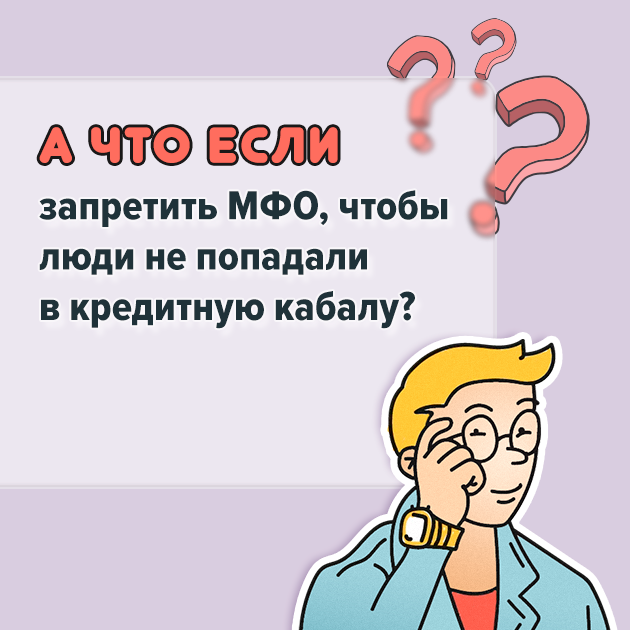 Итак, если взять и запретить МФО, люди срочно нуждающиеся в деньгах, скорее всего будут вынуждены пойти к нелегалам. Очевидно, что никому от этого лучше не станет.