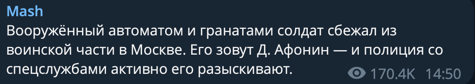 Что проверяем Правда, что из одной воинских частей Москвы сбежал вооруженный солдат? С чего все началось Вооруженный автоматом и гранатами солдат сбежал из воинской части в Москве — такой заголовок пробежался по всем популярным пабликам столицы и не только. Источники утверждают, что полиция и спецслужбы активно разыскивают преступника. Как на самом деле Это фейк. Преступником оказался телефонный террорист, позвонивший в военкомат в состоянии алкогольного опьянения. Он сообщил, что сбежал «в самоволку с автоматами и гранатами» и «скоро придет взрывать». Звонившего уже ищут. Источник опровержения Официальный телеграм-канал агентства ТАСС