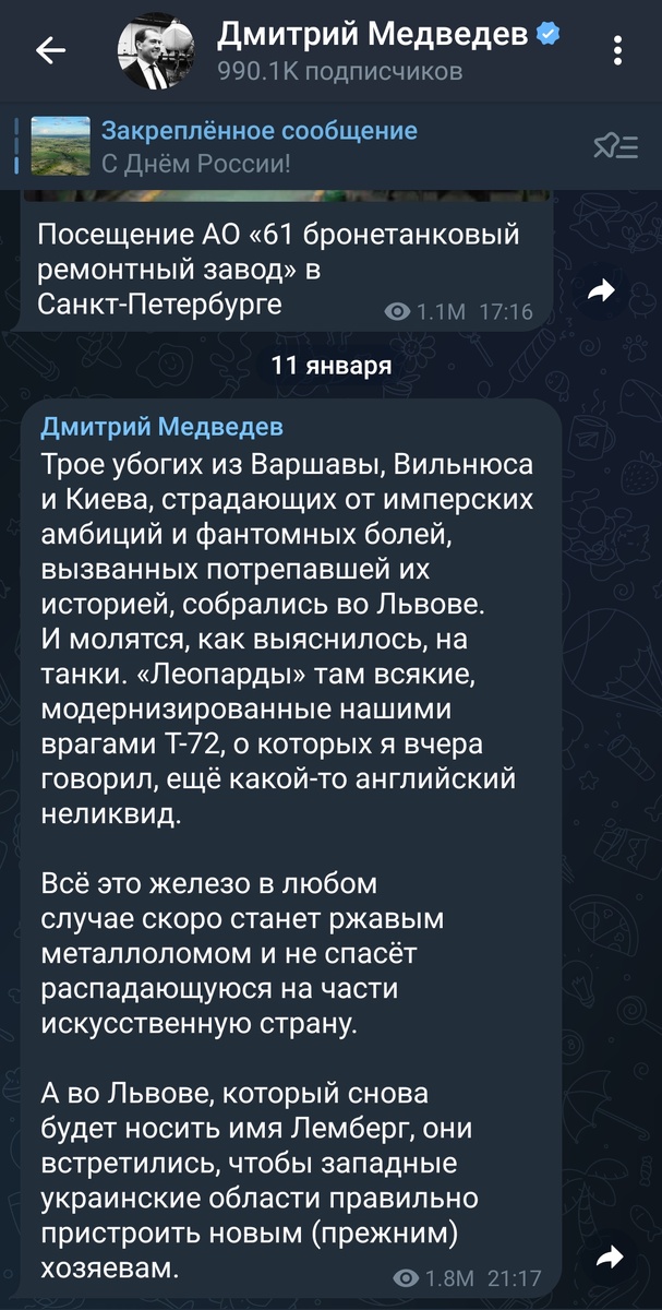 Во Львове, 11 января, прошел второй саммит Люблинского треугольника. По итогу саммита было сделано заявление от президентов Польши, Украины и Литвы. Поэтому поводу Заместитель председателя Совета безопасности Российской Федерации Дмитрий Медведев написал в своем Telegram канале следующее: