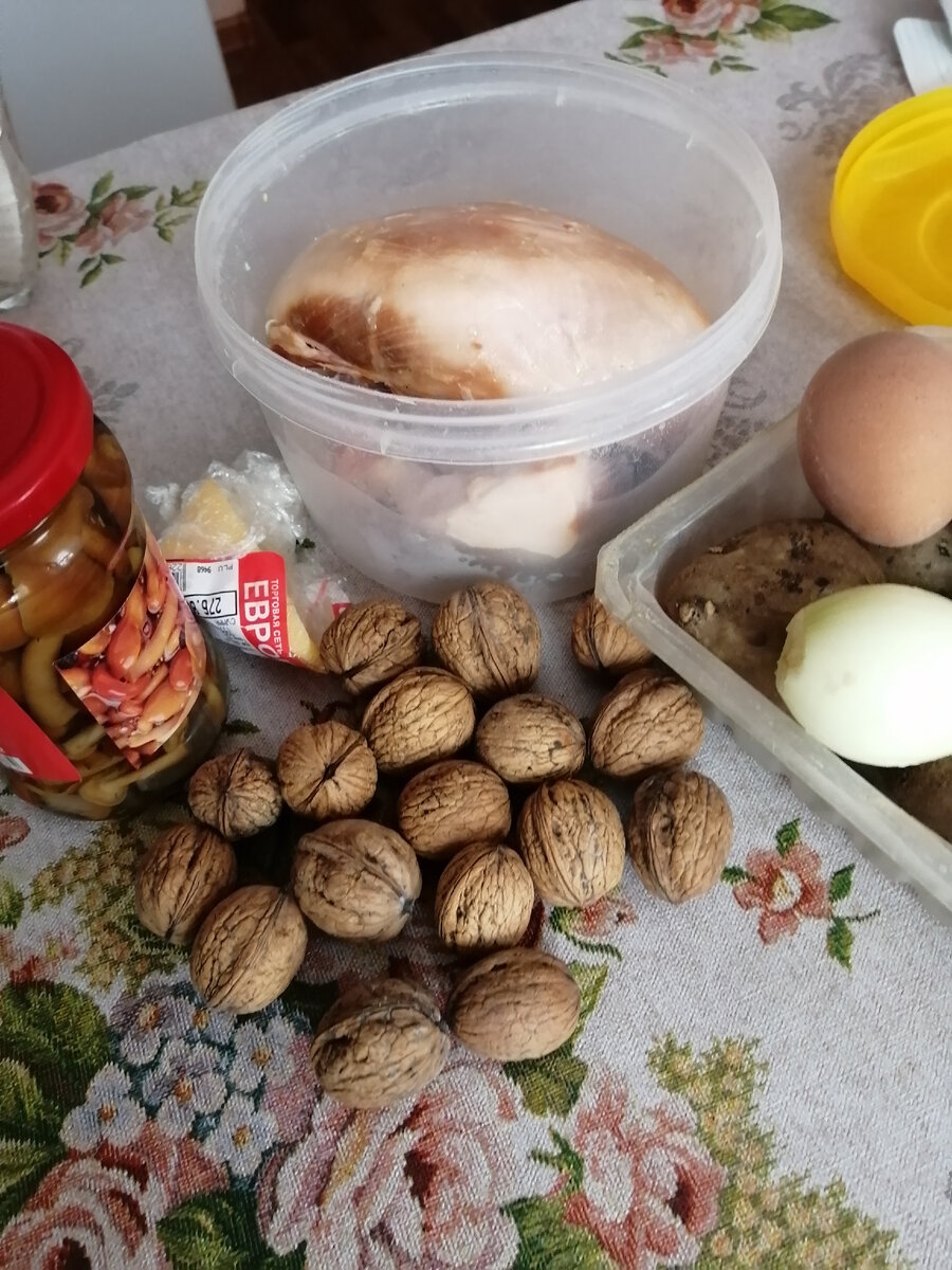 Завтра старый новый год. И это отличный повод порадовать себя чем-то вкусненьким. Это праздничный не бюджетный вариант, но очень вкусно! Салат делаем слоями. Первый - мелко порезанный лук. Второй - отварной картофель. Некоторые просто режут, я тру на тёрке. Мне кажется так нежней. Майонез. Третий слой - копчёная курочка, у меня грудка. Четвёртый - маринованные опята. Прям целиком. Майонез. Пятый - тертые яйца. И ещё немного промазать. Шестой - сыр. Седьмой - много грецких орехов. Салату надо дать настояться и пропитаться. Завтра после работы он меня порадует. Рецепт салат "Королевский" : - одна луковица - шесть средних картофелин - 400 граммов копчёной курицы - баночка маринованных опят - 4 яйца - 100 граммов сыра - 23 ореха Приятного аппетита!