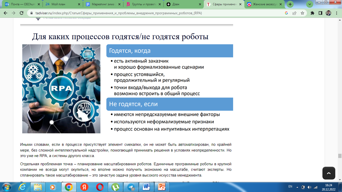 RPA в помощь. Как цифровые роботы меняют HR Уволят ли роботы всех людей? Как будет строиться работа в HR завтра? Каким образом HR-специалисту снизить растущую нагрузку и на себя и на других? Цифровизация бизнеса по всему миру продолжается полным ходом. Одним из самых популярных трендов последнего времени является использование в работе блока HR цифровых роботов (RPA). RPA (Robotic process automation) - использование цифровых или программных роботов (software robots) в автоматизации бизнес-процессов, когда робот заменяет человека в выполнении определенных рутинных механических действий, освобождая его для более важных задач, связывает работу удаленных друг от друга офисов, исключает частые ошибки, связанные с человеческим фактором или помогает ускорить принятие управленческих решений. Вопрос №1: Уволят ли роботы всех людей? И это самый простой вопрос для ответа. Нет, конечно. Мы с вами такое точно не застанем. Уровень искусственного интеллекта еще не превосходит людей в выполнении умств