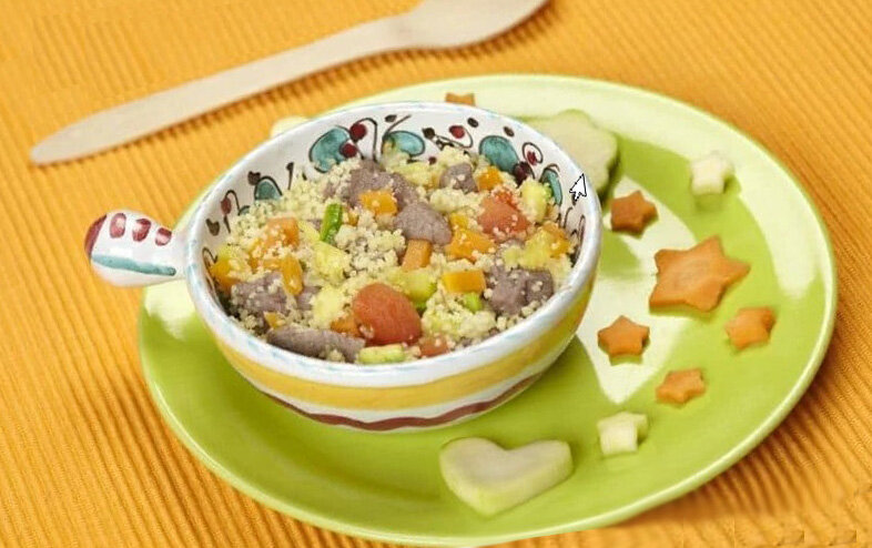 Хорошее блюдо, богатое белком и витаминами группы В, которые необходимы для нашего организма и просто вкусно. Также это блюдо нравится детям и с удовольствием его едят. Ингредиенты: Подготовка мяса Морковь необходимо очистить и нарезать кубиками. Кабачки также вымыть и нарезать кубиками. Помидоры вымыть и ошпарить несколько минут в кипящей воде. Очистите их и нарежьте кубиками. На сковороде разогрейте оливковое масло первого холодного отжима и обжарьте мелко нарезанный лук. Добавьте мясо баранины, нарезанное небольшими кусочками, и варите несколько минут. Налейте немного вина и дайте ему растаять. Если будут есть дети, то не советую добавлять вино. Добавьте все нарезанные кубиками овощи, посолите и варите, накрыв с крышкой около получаса. Тем временем приготовьте кускус, следуя указаниям на упаковке. Подготовка кускуса Настоящий кускус имеет корни из Северной Африки и Марокко и готовится долгое время. В то время как тот, который мы знаем и который мы покупаем в продуктовом магазине