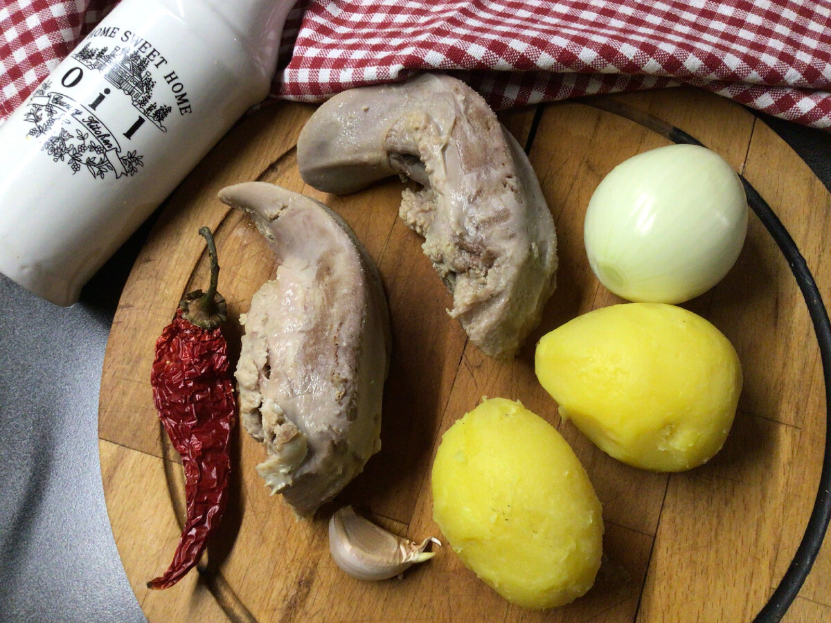 Здравствуйте, дорогие подписчики и гости моего канала. Предлагаю вам, мои уважаемые повара, приготовить сегодня очень на мой взгляд интересную закуску. Данный рецепт я точно нигде не подглядывала и не подслушивала в подъезде или в трамвае. Просто захотелось что-то приготовить из свиных языков. Идей было несколько, но выбор остановился на этом. Да и время на приготовления самое минимальное, как и ингредиентов. Сразу скажу, что закуска получается интересной и очень сытной. Знаю, что опять кто-нибудь напишет, что на ужин нельзя сытные блюда. Друзья, лично я таких людей не понимаю. Утром кофе с “приглядкой”, в обед небольшой перекус на работе, а вечером что- нибудь лёгкое. От такой диеты, быстро язву желудка заработаешь или ноги бегать перестанут. Лично я за полноценный, сытный ужин, особенно для мужчин. Набор ингредиентов для ужина. Заранее отвариваем в подсоленной воде свиные языки. Затем пока они горячие с них надо снять шкурку. Также в мундире отвариваем картофель, и тоже затем