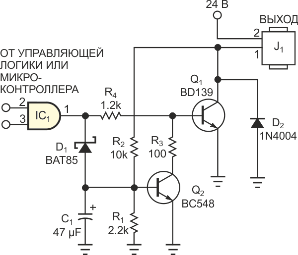 Общепринятая практика для устройств управления в промышленных приложениях – использование цифровых выходов с открытым коллектором. Используя такие выходы, можно коммутировать такие нагрузки, как реле, лампы, соленоиды и нагреватели. Одной из проблем, присущих выходным каскадам этого типа, является замыкание выхода на шину питания (часто 24 В), что может вывести из строя выходной транзистор, если он не имеет защиты. Самый простой подход к решению этой проблемы – использование предохранителя. Однако у этого метода есть недостаток: предохранитель нужно заменять после того, как он перегорит. Термисторы с положительным температурным коэффициентом (самовосстанавливающиеся) часто слишком медленны, чтобы защитить транзистор от короткого замыкания. Другая возможность основана на использовании в качестве переключающего элемента источника тока. Этот способ безопасен и прост, но в аварийном режиме схема выделяет тепло. Если номинальная мощность и охлаждение транзистора недостаточны, он выходит из строя из-за перегрева. Схема на Рисунке 1 демонстрирует еще один простой подход к реализации отказоустойчивой защиты таких коммутационных устройств.