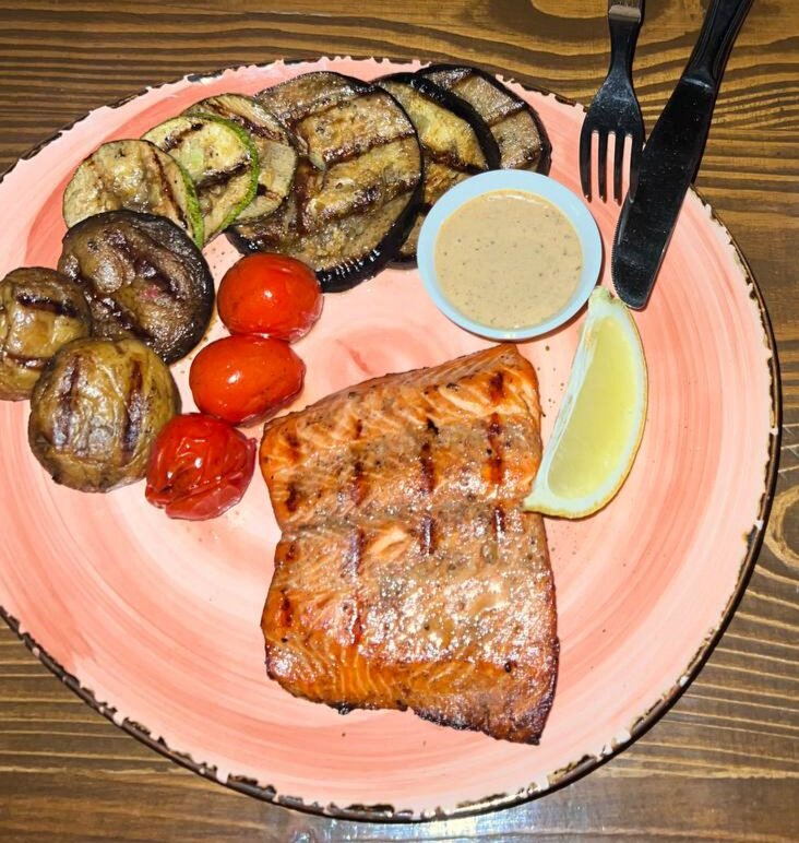Сразу хочу объяснить, что лосось это не конкретная рыба, а целое семейство лососевых, к ним относятся: горбуша, кета, семга, харис и многие другие. В наших магазинах проще всего найти семгу, горбушу и форель. Лосось богат различными витаминами, такими как А, В1,В2, С Так же в лососе есть элемент ниацин, которые положительно влияет на работу пищеварительной, нервной и кровеносной системы. Фосфор и калий которые содержится в лососе так же незаменим для профилактики сердечно сосудистых заболеваний. Перейдем непосредственно к рецепту. Для приготовления стейка нам понадобится: стейк из лосося массой примерно 200 грамм. Соевый соус Соус ворчестер (необязательно, но с ним вкуснее) Веточка тимьяна Соль, соль перец по вкусу Так же можно использовать вашу любимую приправу для рыбы или приправу которую можно найти в каждом продуктовом магазине. Овощи гриль: Томаты чери Кабачок Баклажан Шампиньоны Болгарский перец Переходим непосредственно к приготовлению Стейк из лосося маринуем в соевом соусе, с
