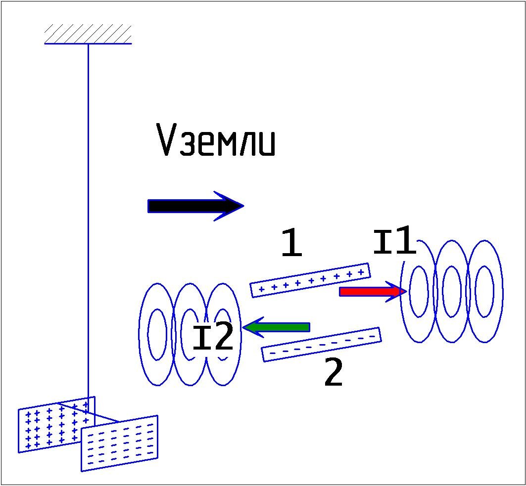 На крутильном подвесе размещён заряженный конденсатор. Предполагается, что в результате движения вместе с Землёй заряды на пластинах порождают противоположно направленные токи. Первоначально Рентген предположил, что такие токи должны порождать в "окружающем пространстве"(!), которое, по Эйштейну (СТО): ПУСТОЕ! - точно такие же магнитные поля, что и от обычных токов в проводниках. Есть разные точки зрения по поводу научного приоритета, но высоклассные работы замечательного российского учёного Эйхенвальда по подтверждению гипотезы Рентгена были признаны всем мировым научным сообществом начала 20-го века. "Релятивистами" принято считать, что движение заряженной пластины, например, 1 в магнитном поле тока от движения заряженной противоположно пластины 2 будет приводить к стремлению пластины 1 занять положение, параллельное току I2. Но ведь это - откровенная глупость: уподоблять электрический ток в пространстве - ПУСТОМ! - электрическому току в проводнике! Это - чистой воды иезуитство: не признавать в физическом пространстве никаких носителей для магнитного поля, но считать, что заряды на пластине 1 будут отталкиваться от "эфемерного" магнитного поля, "подвешенного" в ПУСТОМ пространстве!