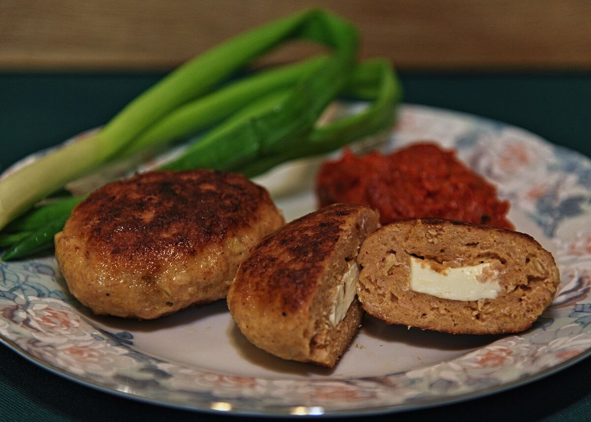 Рецепт плескавицы очень близок к рецепту чевапчичей, отличие, в первую очередь, в форме: плескавица — это плоская котлета классическое формы, в то время как чевапчичи — мясные «пальчики». Тут уж выбирайте, что кому ближе. Плескавица, к тому же, бывает разная — классическая котлета, без начинки, котлета с добавлением в фарш крупных хлопьев сушеного острого перца называется "лесковачка плескавица", котлета с начинкой из сыра и/или ветчины — "гурманска плескавица". Для приготовления этого вкусного блюда Вам понадобятся следующие ингредиенты: Соедините фарш, рубленый лук, хлебные крошки, все приправы, яйцо, посолите и поперчите и тщательно вымесите фарш. Готовый фарш поставьте на холод минимум на час. Откройте фету и нарежьте ее поперек на ломтики толщиной около 8 мм. Из остывшего фарша мокрыми руками скатайте шарики размером чуть больше шарика для настольного тенниса, у вас получится примерно 18 штук. Возьмите один шарик в руку и разомните его в лепешку, по размеру чуть больше, чем отреза