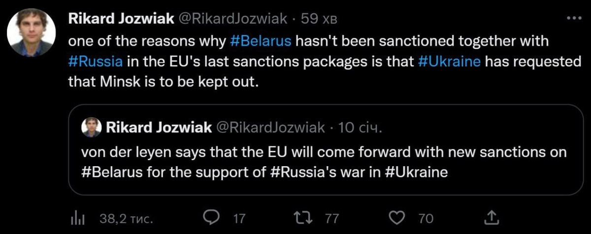 Еще позавчера сигналы были прямо противоположными. Глава Еврокомиссии Урсула фон дер Ляйен на совместной пресс-конференции с главой Евросовета Шарлем Мишелем пообещала ввести новые санкции против Белоруссии и Ирана, поскольку те поддерживают военную кампанию России на Украине. Однако уже сегодня перспектива введения санкций была поставлена под вопрос и, по словам Йозвяка, сделано это было по инициативе самой Украины.