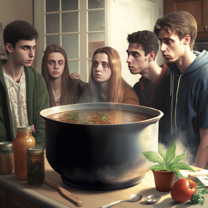 В одном из студенческих общежитий жили студенты, которые были очень близки и любили готовить еду вмести однажды вместе придумали рецепт потрясающего супа для всей общаги. В большой чан добавили в суп куриное мясо, картофель, морковь, свеклу, лук и чеснок. Затем специи и зелень, а так же тыквенные семечки, кориандр и корень имбиря. Когда суп наконец был готов, вся общага собралась вокруг стола, чтобы попробовать его. Каждый пробовал и был поражен его вкусом. Они ели этот суп в течение недели, и каждый раз вкус играл новыми красками. Вот уменьшенный рецепт этого супа: "Общажный суп" Ингредиенты: Приготовление: Этот суп можно есть неделю и каждый день он будет все вкуснее и вкуснее. В зависимости от вашего вкуса можно добавлять различные ингредиенты или менять количество специй. Этот суп станет любимым у всей семьи или