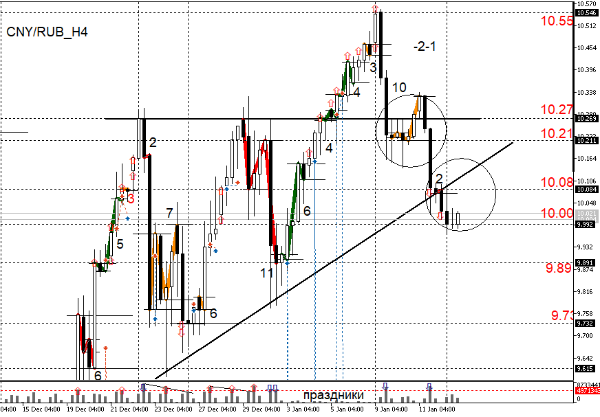 Вчера, 12 января, в 8-00 МСК произошло изменение волновой картины, в результате чего в волновом балансе зафиксировалась нечетная модель [-2-1], общей длительностью 12 свечей. Из тех комбинаций, которые я приводил вчера в качестве основных сценариев развития событий, наиболее актуальными на текущий момент остаются следующие две последовательности: [Здесь в квадратных скобках указана та конструкция, которая уже сформирована] Все эти комбинации, на самом деле, равновероятны, так как дают ближайшие циклы: Поэтому, какой именно сценарий будет реализовываться, сейчас сказать невозможно. Лично я жду, коррекцию в район отметки 10,17, то есть реализацию комбинации [-2-1] (+2) (-2) на 4-х часовом графике. Отчасти, это подтверждает и часовой график пары cny/rub. Так как вчерашнее снижение китайской валюты было совсем незначительным, и проходило оно на относительно небольших объемах (не было всплеска в 16-00 МСК), поэтому есть шанс, что цена может скорректироваться в район 10,17. Если это произой