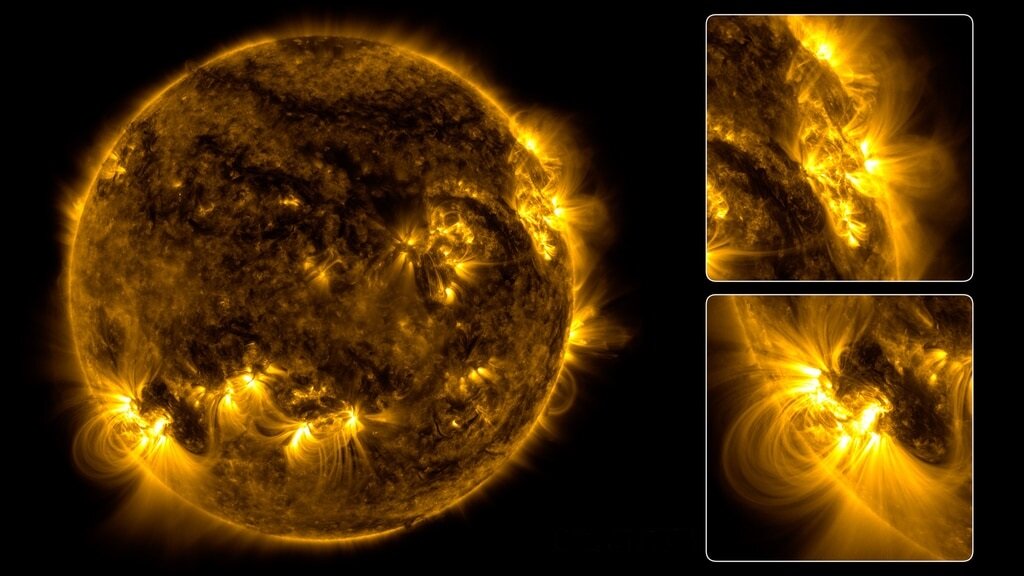 НАСА опубликовало видеозапись наблюдений за солнечной погодой и вспышками с помощью космической обсерватории солнечной динамики (SDO). Видео представляет данные, собранные космическим спутником с 12 августа по 22 декабря 2022 года. События ускорены, чтобы сжать 133 дня в один час. Обсерватория солнечной динамики делает снимок ближайшей к Земле звезды каждые 0,75 с. Фотографии, использованные для создания видео, получены при наблюдении за электромагнитными волнами с длиной волны 17,1 нм. Это экстремальный ультрафиолет, который соответствует солнечной короне — внешней атмосфере звезды. Наблюдения за Солнцем с использованием Обсерватории солнечной динамики. Видео: NASA’s Goddard Space Flight Center На видео видны яркие активные области раскаленной плазмы, движущиеся по поверхности Солнца, пока оно вращается вокруг своей оси. Напомним, один оборот Солнца составляет около 27 земных дней. Над активными областями поднимаются петли плазмы, которые формируются магнитным полем звезды. «Эти яркие