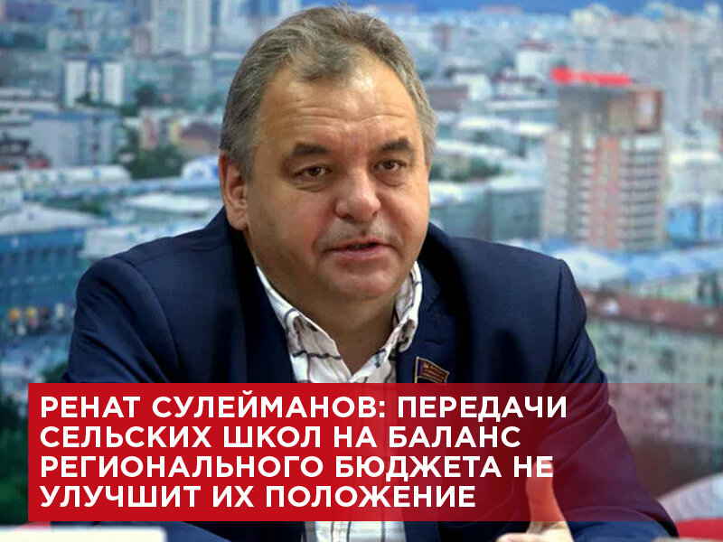 Депутат Государственной думы Ренат Сулейманов считает, что передача сельских школ на баланс регионального бюджета не улучшит материальное положение образовательных учреждений. Также депутат отметил, что большее внимание надо уделить повышению зарплаты учителям, чтобы она была достойной в любом регионе страны.