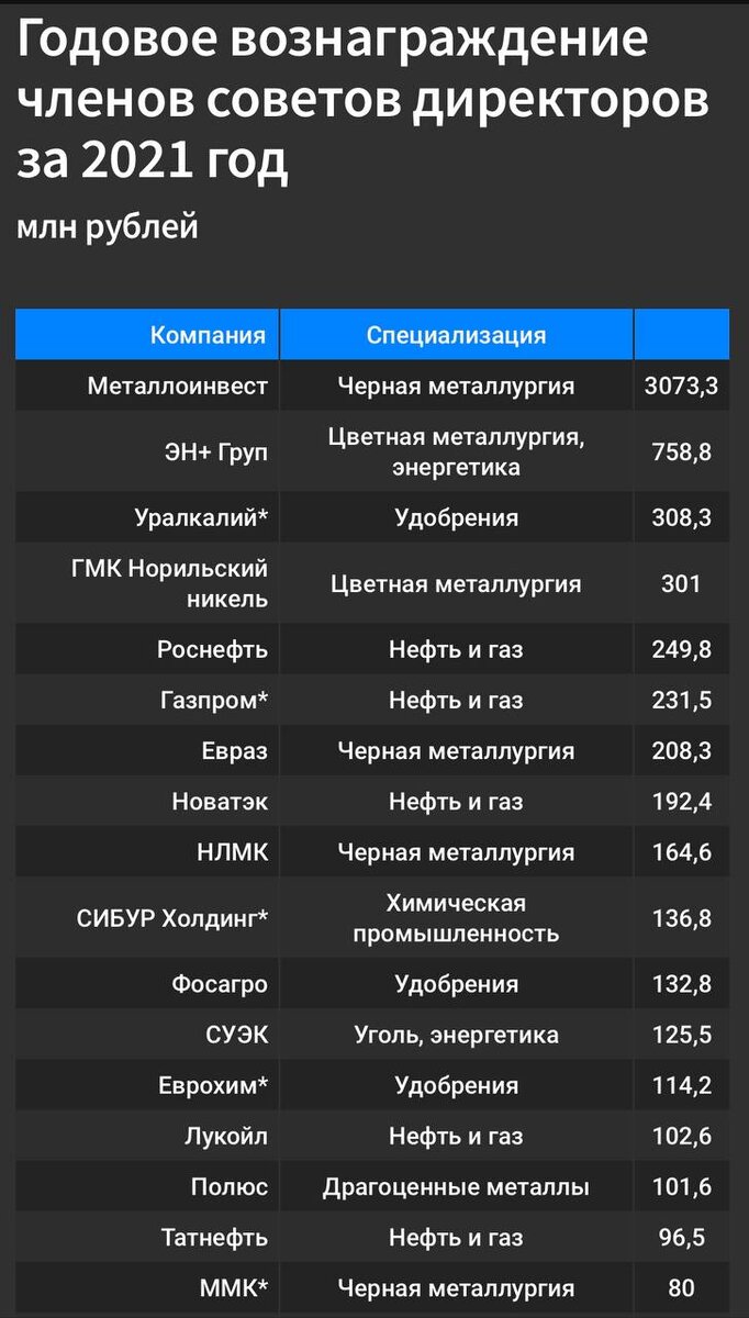 Как именно распределено вознаграждение между директорами в «Металлоинвесте» — неизвестно, но обычно для членов СД устанавливают базовое вознаграждение, дополнительное вознаграждение выплачивается за участие в комитетах (например, комитет по аудиту или стратегии) и исполнение функций председателя комитета, отдельная ставка предусмотрена для председателя СД плюс премии, в зависимости от результатов работы. Поэтому разброс между доходами отдельных директоров может быть как минимальным (например, в НЛМК — от 14,9 млн рублей до 19,6 млн рублей), так и отличаться в разы.
