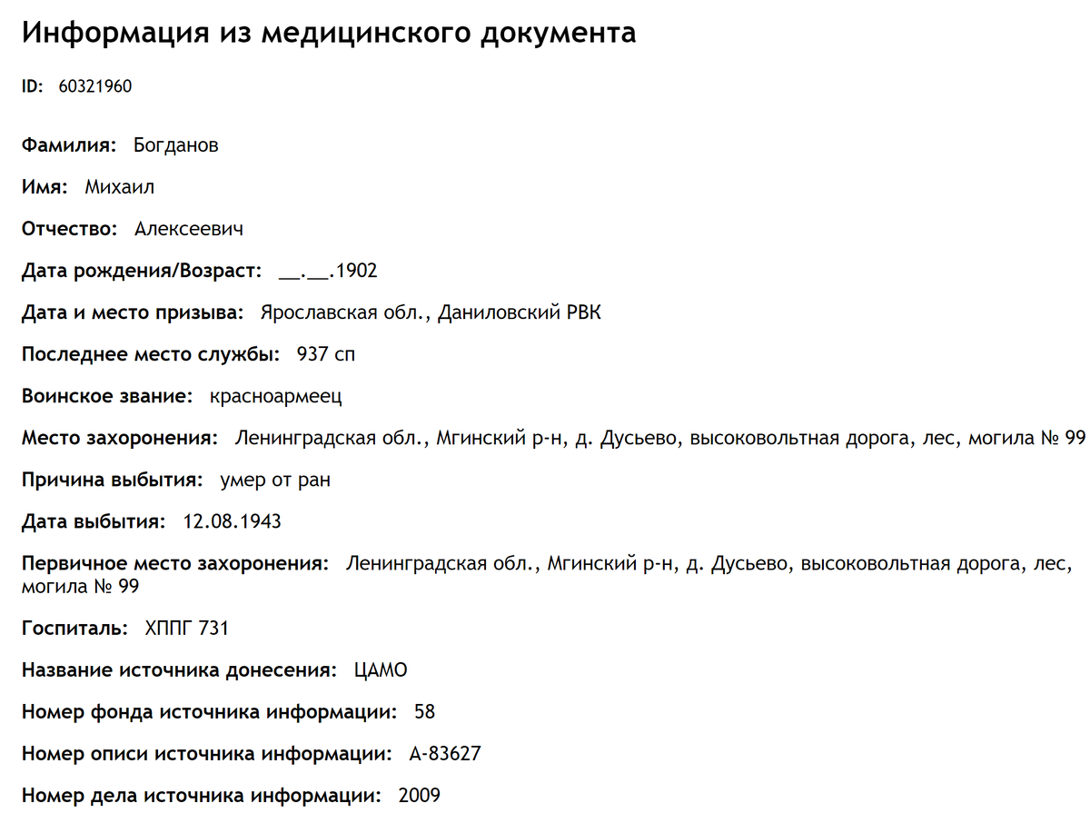 Друзья, я долго думала, стоит ли мне писать об этом статью. Решила, что стоит, потому что могут быть люди, которые столкнутся с такой же ситуацией, как и я, и не будут знать, что делать. У моего прадедушки, Богданова Петра Алексеевича, был брат, Богданов Михаил Алексеевич, который погиб в годы войны под Ленинградом. Его потомки до сих пор проживают в Ярославле. На момент начала всей истории я познакомилась с его уже старенькой дочерью, внуками, правнуками. И я нашла про него следующую информацию: На тот момент я еще не знала, что означает словосочетание "первичное место захоронения", и пообещала его дочери съездить на могилу отца и положить от нее цветы. Лишь потом, когда я стала разбираться, как доехать до этого кладбища, я поняла, что эти слова означают, что, возможно, было перезахоронение под мемориал. И ключевое слово здесь - "возможно", потому что по факту в моем случае с этого воинского госпитального кладбища под мемориал в Эхново во время прокладывания линии электропередач были