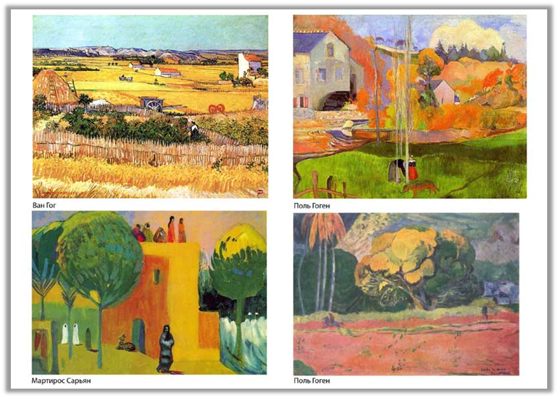 В ходе работы мы будем создавать яркий декоративный пейзаж. Основные художественные средства – цветные, интересные по силуэту пятна, «живая» линия. Стиль будет декоративным, но перспектива и глубина будут присутствовать. Но не «воздушная» (когда исчезает четкость, ясность), а за счет рисунка (уходящая вдаль река, уменьшающиеся предметы), ритмов и чередований пятен – на переднем плане более насыщенные краски, чем на дальнем. Многие знаменитые художники середины-конца 19 века, всего 20 века искали новые пути «видения», понимания и изображения окружающей среды. Они осознанно использовали яркие и «открытые» цвета для передачи не столько реального вида, а сколько своего отношения к увиденному. Цвет становится инструментом передачи психологического состояния – радости, счастья, тревоги, печали, сомнений и еще множества других чувств. Цвет, пятно, линия становятся самоценны сами по себе, они выходят даже за рамки самого предмета и явления. Истоки такой необычной яркости и любви к