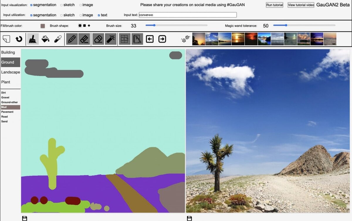 Графический редактор с функциями нейросети и машинного обучения. Умеет создавать максимально реалистичные изображения ландшафта, которых в реальности не существует. Для этого достаточно лишь описать словами, что нужно получить на изображении или схематически нарисовать расположение элементов. http://gaugan.org/gaugan2/