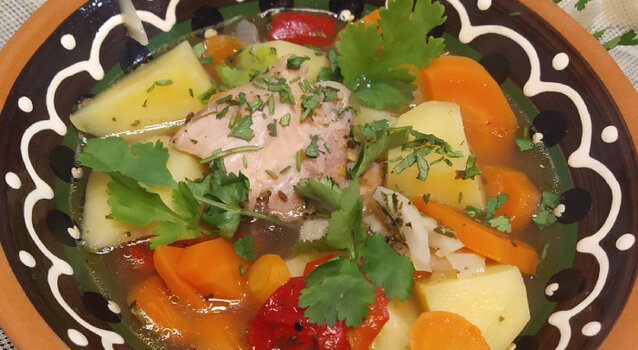Классическая шурпа готовится из баранины или говядины, обязательно в казане на открытом огне, где мясо долго томят. Но вариантов рецепта шурпы много, и на востоке ее готовят также и с курицей, называется дарман шурпа, в домашних условиях так получается намного быстрее и менее жирно. А чтобы сохранить «тот самый» вкус, будем томить шурпу в духовке, в глиняных горшочках. Сталик Ханкишиев предлагает добавлять в домашнюю шурпу немного копченого сала, чтобы придать ей слегка дымный вкус шурпы, которую готовят на открытом огне. Отличительная черта шурпы – большое количество лука. Кроме него, как и в любом азиатском блюде, обязательны приправы – кориандр, зира, острый перец, а также не обойтись без свежей зелени. Шурпа из курицы Ингредиенты (на 7 порций): - курица (бёдра) — 7 шт.; - копчёное сало — 3-4 ломтика; - репчатый лук — 4 шт.; - морковь — 2 шт.; - картофель — 7 шт.; - кислое яблоко — 1 шт.; - красный сладкий перец — 2 шт.; - корень сельдерея — 1/4 (можно сушеные коренья петрушки, паст
