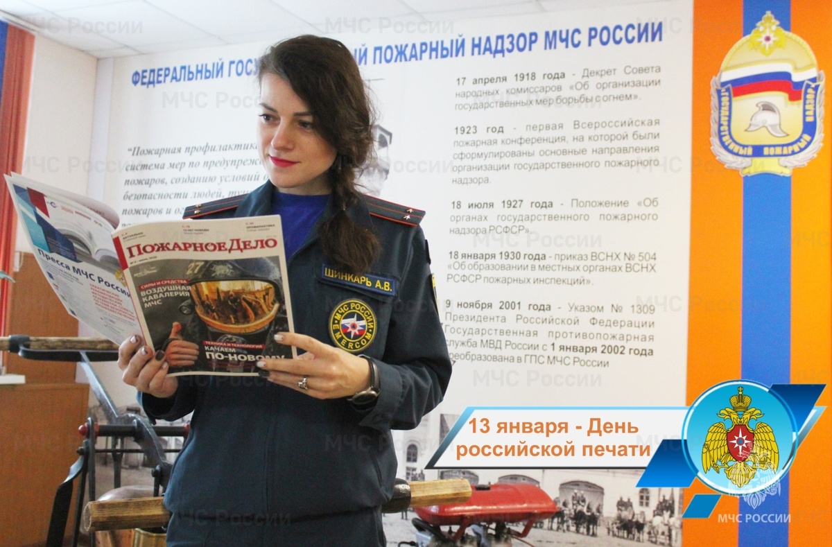13 января в России отмечается профессиональный праздник работников периодической печати, средств массовой информации, журналистов - День российской печати. Дата праздника выбрана не случайно. В этот день в 1703 приступила к своей работе первая в России регулярная газета «Ведомости» со скромным на тот период тиражом в тысячу экземпляров. Редактором был сам Петр I. Параллельно по его указу открывались рестораны, в которых собирались люди для чтения газет. Им бесплатно предоставлялся чай и сладости. Это мероприятие император рассматривал, как возможность в доступной форме рассказать о новых реформах и их необходимости для развития России. МЧС России выпускает ведомственные издания, которые освещают весь спектр деятельности чрезвычайного ведомства и вопросы безопасности. Журналы «Гражданская защита», «Пожарное дело», «ОБЖ» и газета «Спасатель МЧС России» знакомят читателей с основами безопасности жизнедеятельности, рассказывают о деятельности спасательной службы, о средствах и способах защ