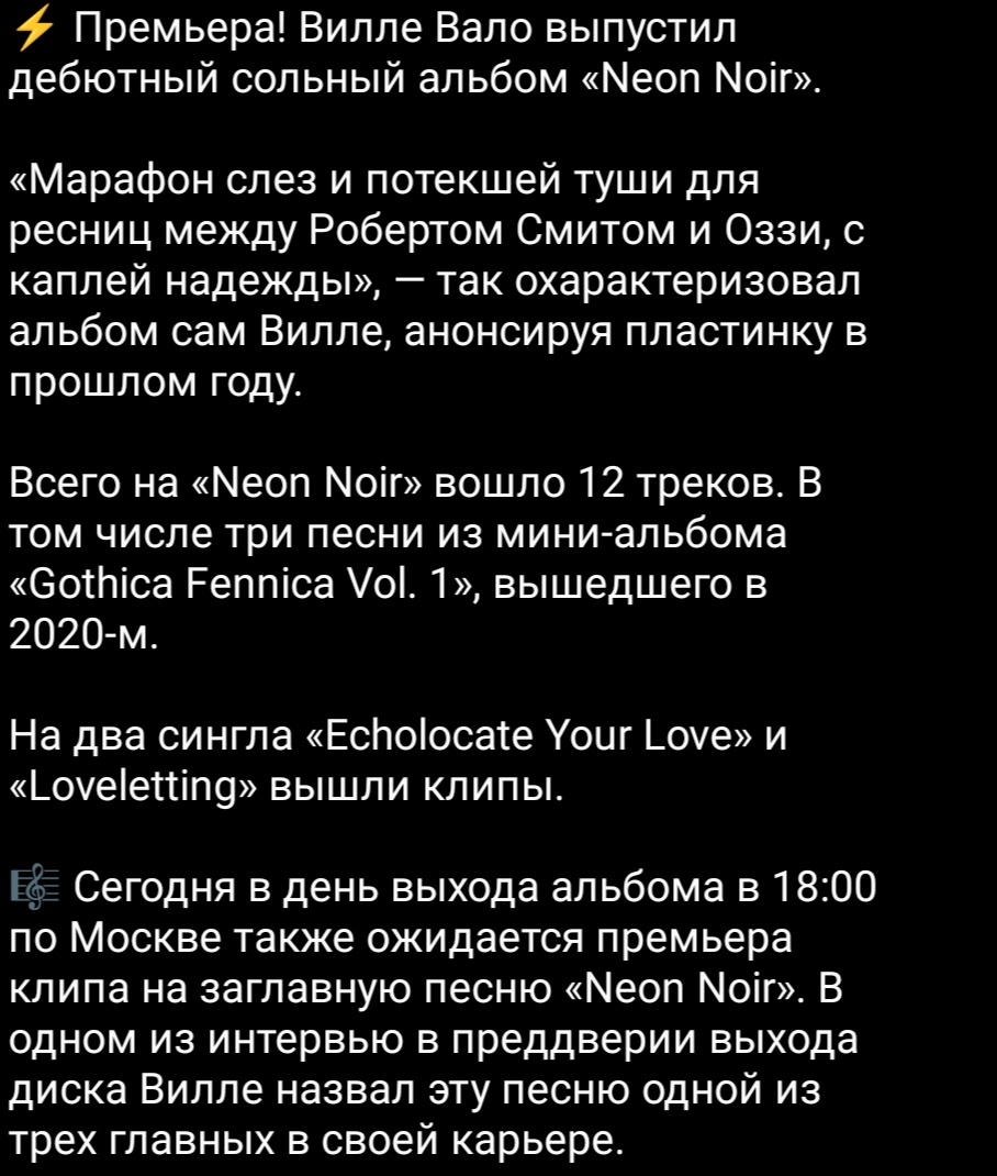 Альбом получился достаточно сильным, интересным и очень в стиле типичного финского рока и метала. Это нельзя назвать HIM - это уже совершенно другое. И это шаг вперёд для VV. Из всех песен мне понравилось Run away from the sun, Neon noir и Loveletting.