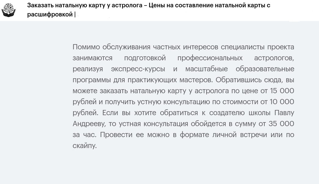 Наткнулся, знаете ли, в интернете на прекрасное. Не буду ходить вокруг да около, сразу цитата из одного паблика: Натальная карта – это главный инструмент астролога. Именно по ней он определяет ключевые узлы в судьбе человека, предупреждает о сильных и слабых сторонах, может рассказать о карьере, семье, состоянии здоровья. Я бы добавил: составление натальной карты - это очень нужное и важное дело. Для астролога! Цены на услугу - от 15 тысяч рублей!!! (В регионах может и дешевле, не суть). Ещё раз, прописью: пятнадцать тысяч. Да, возникает ощущение, что надо было на астролога учиться. Где тут ближайший астролого-хиромантический университет? Пойду за третьим высшим... Ну, серьёзно, ребята! Вокруг, значит, 21 век. Объём информации в интернете достиг 8 зеттабайт (8 триллионов гигабайт, из которых 99%, допустим, ерунда, но всё-таки есть и что-то полезное). Мы умеем перезаписывать ДНК в клетках живого существа. Почти у каждого в кармане устройство, превосходящее в мощности вычислений компью