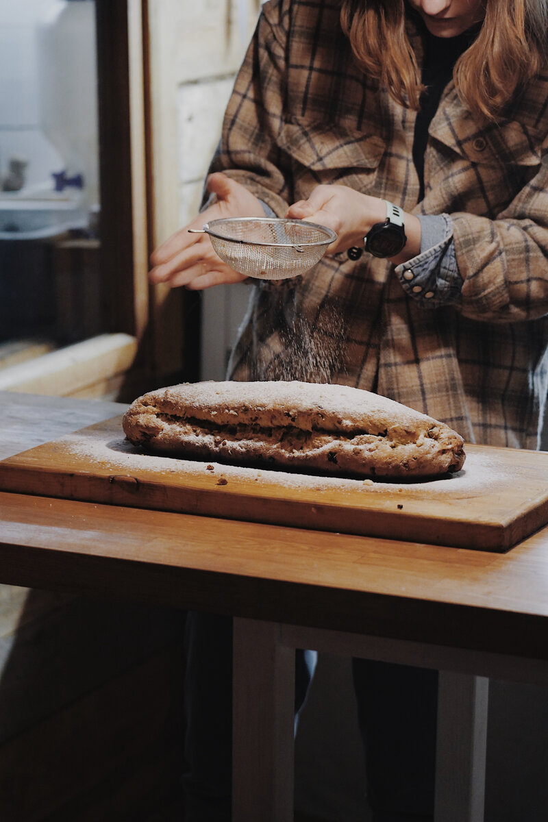 Разогреваем духовку до 180 градусов. Тесто заново месим пару минут и раскатываем в круг. Затем складываем: с каждого края на четверть и затем внутрь. Получается хлебушек (ну или младенец Иисус в пеленках, что символизировал штоллен). Отправляем в духовку примерно на 70 минут.