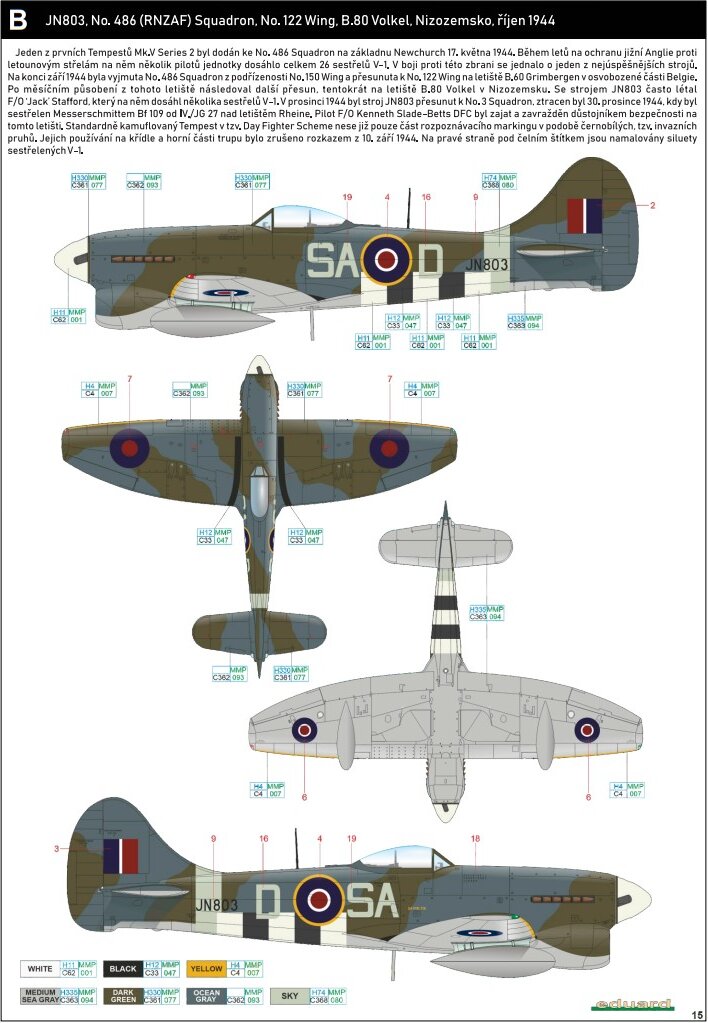 Маркировка B: JN803 #486 (RNZAF) эскадрилья, 122 Авиакрыло В.80 Волкел , Нидерланды. Октябрь 1944. . Tempest-ы второй серии одними из первых, получила 486-я Эскадрилья, на базе Newchurch 17 мая 1944. На этом самолете, в рамках обороны южной Англии от налетов крылатых ракет V-1, пилоты эскадрильи в целом сбили 26 V-1. Tempest являлся лучшим оружием против этих крылатых ракет. В конце сентября 1944 года 486-я эскадрилья была изьята из состава 150-го авиакрыла и передана в подчинение 122-го авиакрыла на аэродром B.60 в Гринбергене, на территории освобожденной Бельгии. После месяца боевой работы, эскадрилья переместилась на следующий аэродром B.80 Волкел в Нидерландах. На машине с номером JN803 летал F/O “Jeck” Stafford, и сбил несколько V-1. В декабре 1944 самолет был передан в 3-ю эскадрилью, потерян был 30 декабря 1944-го года. Был сбит над аэродромом Rheine, Messershmitt-ом BF 109 с IV./JG 27. Пилот F/O Kenneth Slade-Betts DFC попал в плен и был убит офицером службы охраны аэродрома
