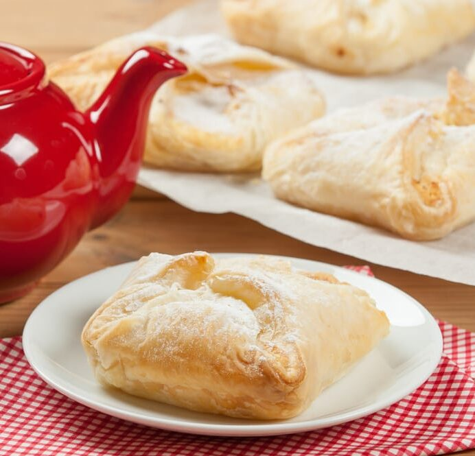 Масло сливочное - 1 ст. л. Тесто нужно разморозить при комнатной температуре, раскатать в одном направлении и нарезать на квадраты со стороной примерно 15 см (хотя, здесь все зависит только от ваших предпочтений, можете сделать их большими или маленькими, вкус не изменится). Творог следует протереть через сито для большей однородности, добавить в него соль, сахар, 1 яйцо. Также я добавила банан, размятый предварительно вилочкой. Все тщательно перемешать. В центр каждого квадрата кладем начинку. Защепляем противоположные углы