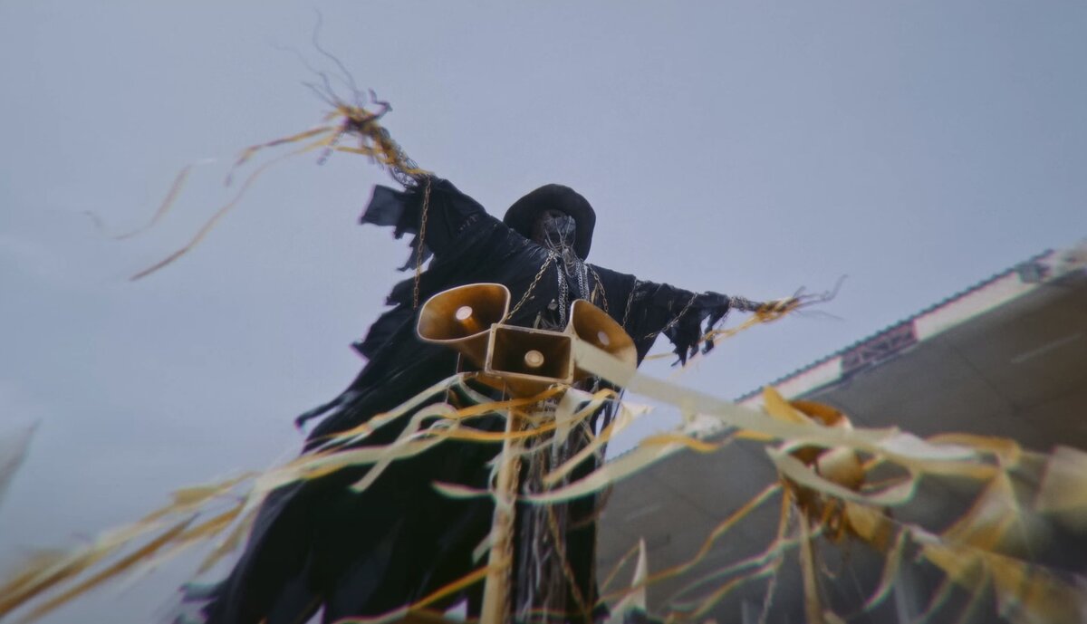 Интересна и загадочна фигура (чем-то напоминающая чучело эпохи чумы). Скорее всего она несет сомволичное значение в клипе.