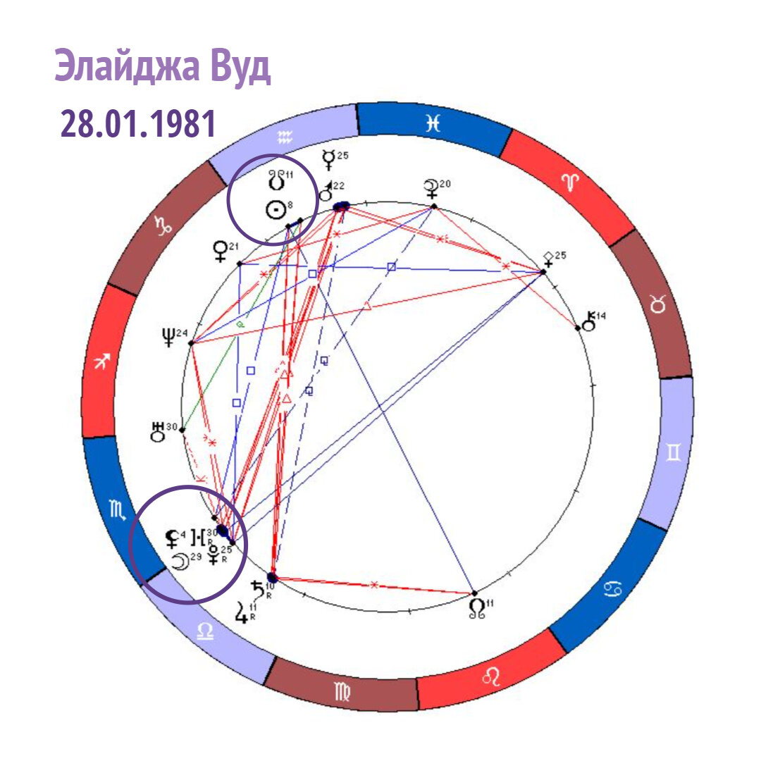 Сегодня 28 января в 1981 родился Элайджа Вуд, тот самый хоббит Фродо из "Властелина колец", его карта привлекла моё внимание тем, что на его изгнанном Солнце стоит Кету, а его падшая Луна в Весах соединяется с Плутоном и заходит в поле Лилит в Скорпионе. Ууух, подумала я, что-то тут маниакальное спряталось 😎 До написания этой заметки я и не знала, что в 2012 он сыграл главную роль в фильме "Маньяк", да и "Властелин Кольца" тоже с признаками мании... пойду пересмотрю 😏 Каждый день, ну, или почти 😃 я пишу небольшие астро заметки об именинниках у себя на канале в телеграм 👈, присоединяйтесь! Начну с Кету, - это хвост дракона, распечатывающий опыт прошлых воплощений, но закрывающий Солнце, поэтому с одной стороны, ставку нужно делать на развитие своей команды (Водолей, а не себя (Солнце)), но в тоже время Кету закрывает и знак Водолея, т.к. с другой стороны, голова дракона или Раху смотрит на знак Льва, а его управитель снова Солнце! Получается путаница, перевёртыш. Я начинала с авест