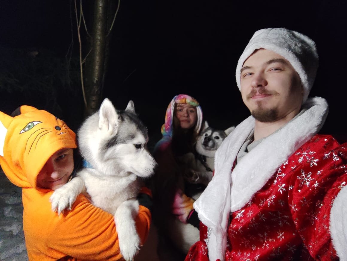 Со стороны зрелище было комичное – две фигуры поменьше, в кигуруми лисы и радужного единорога, которые ведут собак, и третья – в облачении деда мороза тащит за собой большую аморфную кучу чего-то. И ещё машет «световым мечом» (лампой), освещая себе путь.