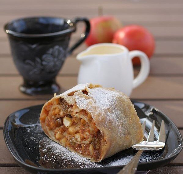 К нарезанным яблокам добавить лимонный сок, панировочные сухари в масле, корицу с сахаром, изюм, миндаль – все перемешать и оставить настаиваться.