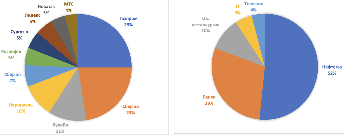 Как выглядит портфель акций РФ у среднего инвестора на Мосбирже по итогам декабря 2022: 1. Газпром - 25% 2. Сбер ао - 22,6% 3. Лукойл -11,5% 4. Норникель - 10,1% 5. Сбер ап - 6,5% 6. Роснефть - 5,3% 7. Сургутнефтегаз ап - 5,3% 8. Яндекс - 5,2% 9. Новатэк - 4,5% 10. МТС - 4% По секторам: Нефтегаз - 51,6% Банки - 29,1% Цв. металлургия - 10,1% IT - 5,2% Телеком - 4% Роснефть с Яндексом поменялись местами - увеличилась доля Роснефти и сократилась в Яндексе. Увеличилась доля Новатэка и сократилась в МТС, что также привело к изменению их позиций в рейтинге. В остальном приоритеты не поменялись. Самые популярные фонды: