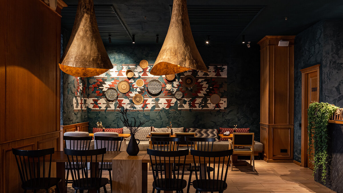 Студия Up To You создала современную версию ресторана грузинско-узбекской кухни «Заказчики хотели создать теплую, гостеприимную атмосферу традиционного грузинского ресторана, но современными средствами» Ресторан располагается на двух этажах торгово-развлекательного комплекса «5 Озер» и способен принять 220 гостей. Заказчики ставили задачу создать теплую гостеприимную атмосферу Грузии. Передать ее аутентичность, но с современными элементами. Поэтому дизайнеры использовали в интерьере много состаренных материалов и национальных предметов декора вроде грузинских тканей и керамических тарелок, которые они повесили на стены. «Всю архитектуру, доставшуюся ресторану от предыдущих арендаторов, было решено оставить, — рассказывает дизайнер Мария Федорова. — Мне предстояло декоративными приемами полностью изменить пространство, поэтому я выбрала для стен темную штукатурку сложного цвета. Она очень красиво сочетается с деревянными элементами интерьера». На первом этаже выстроили сложную конструкц