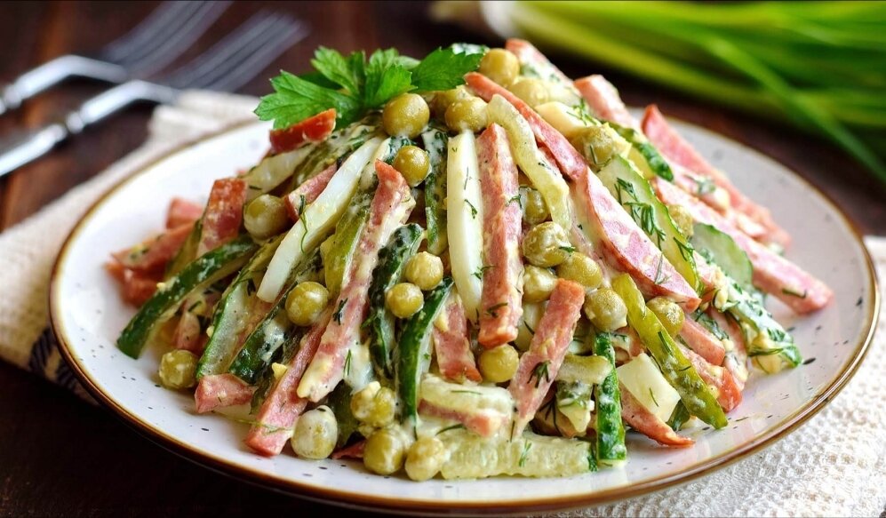 Колбаску, огурцы и лук режем соломкой. Всё смешать, добавить горошек, мелко рубленные яйца, соль по вкусу. Заправить майонезом, перемешать. Приятного аппетита!