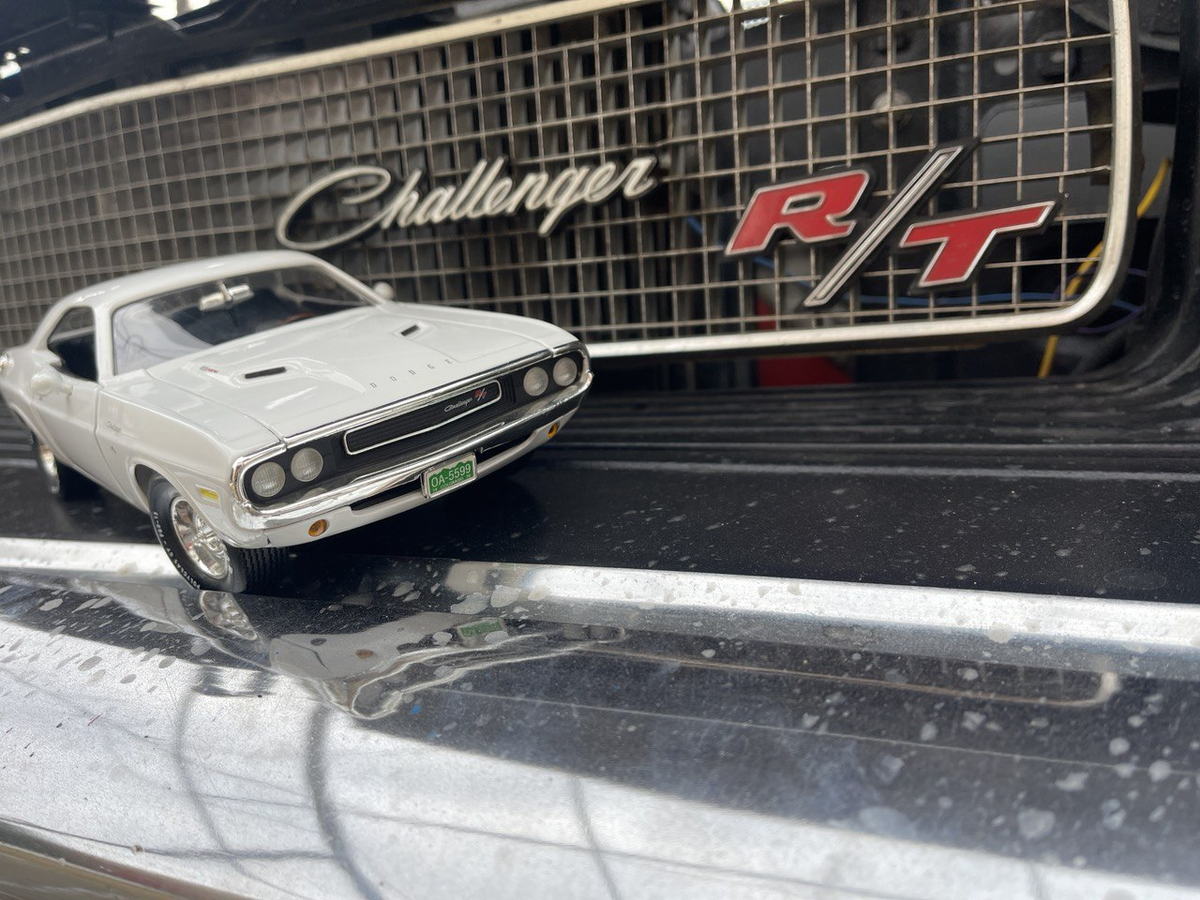 Мы приветствуем всех на нашем канале, Новогодние праздники позади и все потихоньку возвращаются к обычной размеренной жизни и повседневным заботам и делам. Мы решили рассказать одну коротенькую, но милую историю о небольшой, но очень симпатичной вещице, которая уже несколько лет радует нас своим присутствием. В процессе плановых заказов запчастей для восстановления челенжера, на одной из интернет площадок в сша попалась моделька челенжера, аналогичная нашему проекту, но как говорится, на максималках. А конкретно в комплектации с двигателем Хеми. Ранее в нашей статье описывались комплектации рт, после хеми по мощности идет комплектация с двигателем магнум 440 таким, же как у нас в работе, Отличия в мощности несколько десятков лошадиных сил. Заказ этой партии запчастей в основном состоял из элементов маркирующих автомобиль, таких как оригинальные Шилды, указывающие маркировку двигателя и принадлежность данного автомобиля к версии рт, не достающие элементы хромированных молдингов и р