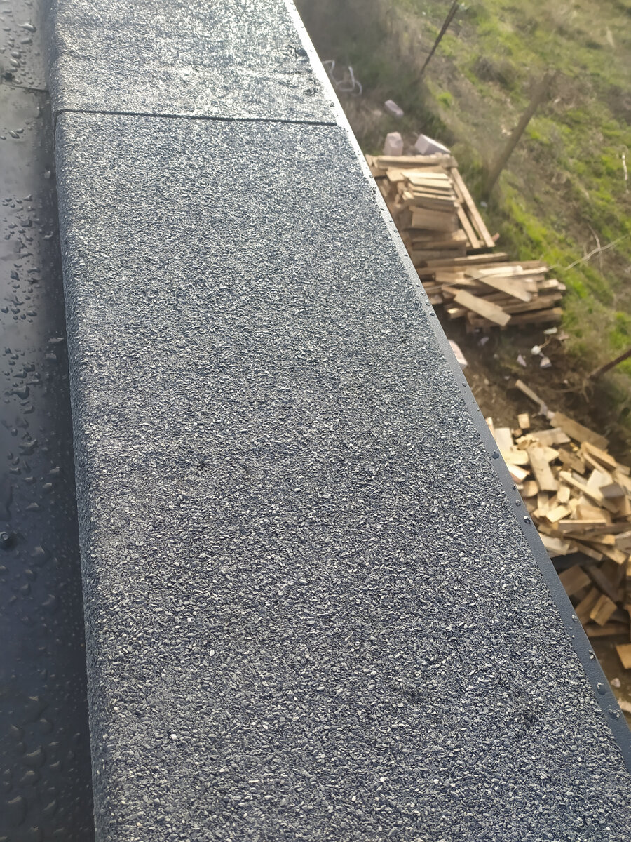 Здравствуйте! Как наверное уже многие поняли, на новом доме пологая односкатная кровля. Почему я сделал такой выбор, потом как нибудь объясню, сейчас расскажу как сделал парапет. Сначала думал заказать , что бы изготовили гнутые элементы, даже посчитали, но передумал. По прямой части еще можно смонтировать, по стенам со скатам, получилось бы не очень. Поэтому вместе с кровлей докупил на весь периметр планки капельника, приклеил на наружную часть газоблока, изнутри встала планка примыкания. А вот пространство парапета от капельника до планки примыкания решил заклеить наплавляемой кровлей. Искал давно знакомый унифлекс, от компании Технониколь, в наличии в Феодосии нет, только стеклоизол, не очень хороший вариант для около нулевой температуры на улице, но при определенной аккуратности пойдет. Тем более цена в два с лишним раза дешевле, чем унифлекс. Праймер у меня немного оставался, самые сомнительные участки обработал. Ветер и сырость не дали сделать более аккуратно, главное