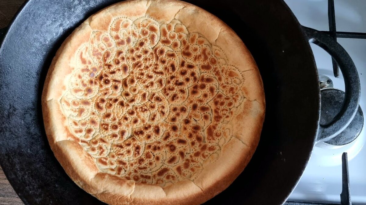 Ингредиенты : Мука 300-350 гр Молоко 150 мл ( теплое ) Растопленное сливочное масло 50 г Дрожжи 1 ч.л Соль 1ч.л Сахар 1/2 ч.л Приготовление : Шаг 1 В миске смешиваем все наши ингредиенты и очень тщательно перемешиваем , чтобы получилось упругое тесто . Сформируем в шарик . Накрываем и оставляем на 30 минут . Шаг 2 После того ,как тесто отдохнуло формируем лепешки . В центре шарика с помощью кулака выдавим серединку, чтобы она стала плоской, в то время как края лепешки должны оставаться толстыми. Нужно помогать себе костяшками указательных пальцев Затем сделаем узоры чекичем-специальным приспособлением для накалывания лепешек. Шаг 3 В разогретый казан распределим лепешку . И на среднем огне готовим лепешку переворачивая каждую сторону ,чтобы подрумянилось равномерно. Так же готовим вторую сторону лепешки . Шаг 4 Когда обе стороны подрумянились . Одну сторону смазываем молоком слегка и переворачиваем , но не сдавливаем . Плотно накрываем казан крышкой и на маленьком ог
