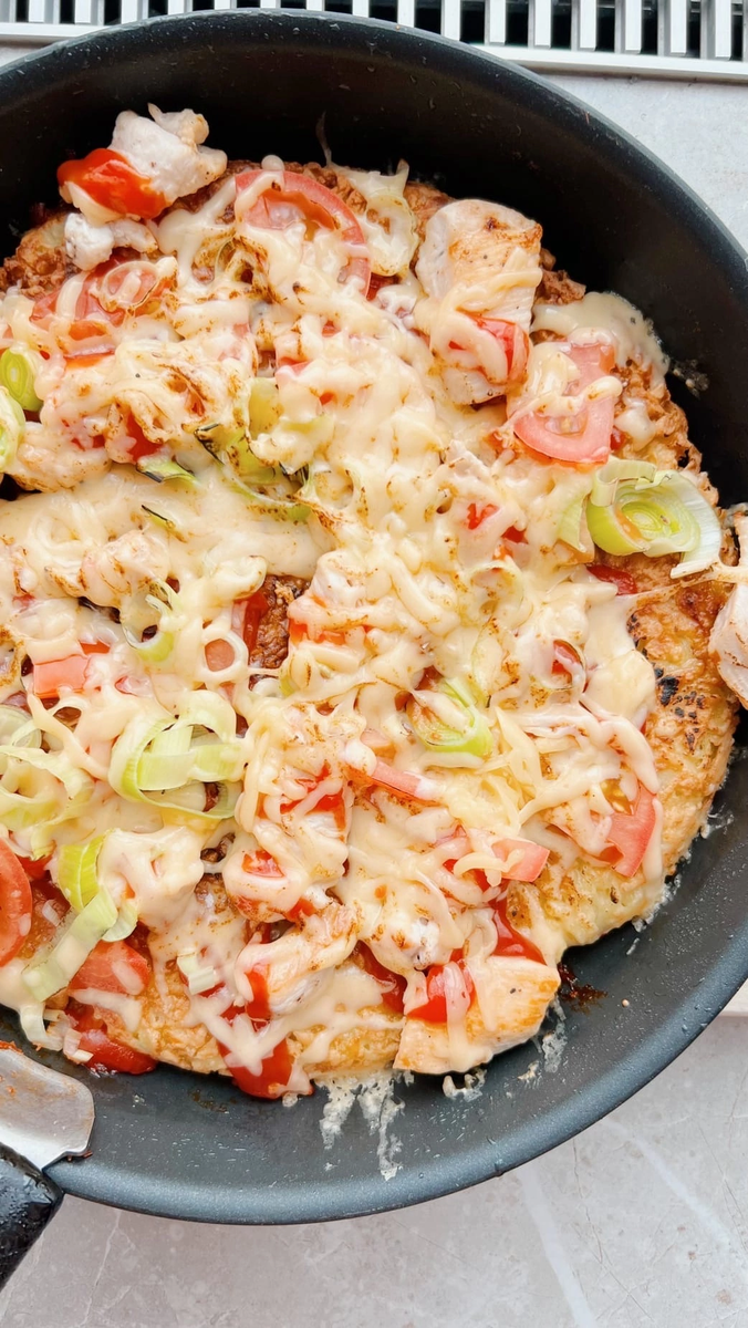 Картофель 1 кг Яйцо куриное- 2 шт. Куриное филе- 500 г. (1заранее обжарьте) Сыр-100 г. Томат - 1 шт. Лук порей (немного) Мука- 50 г. Соль, перец Масло для жарки Картофель натрите на терке, слегка отожмите. Добавьте яйца, муку и приправьте, хорошо перемешайте. Переложите массу на хорошо разогретую сковороду, смазанную маслом. Выпекайте на среднем огне под крышкой 10 минут. Переверните лепешку с помощью тарелки, разложите начинку (по желанию добавьте соус) и готовьте еще 10 минут.