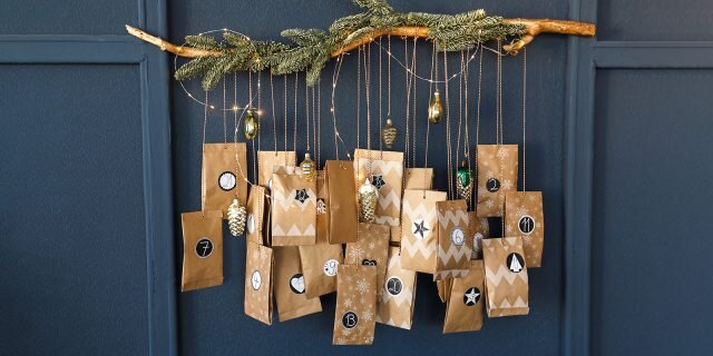 Можно сделать календарь из чего угодно и придать ему любую форму. Например, развесить пронумерованные мешочки на стене или самодельной ёлочке, смастерить панно с кармашками, составить зимнюю композицию из домиков — всё зависит от вашего вкуса и фантазии. Вместо игрушек, конфет и прочих подарков можно положить внутрь записки с заданиями для новогоднего настроения: нарядить ёлку, слепить снеговика, испечь печенье и так далее.