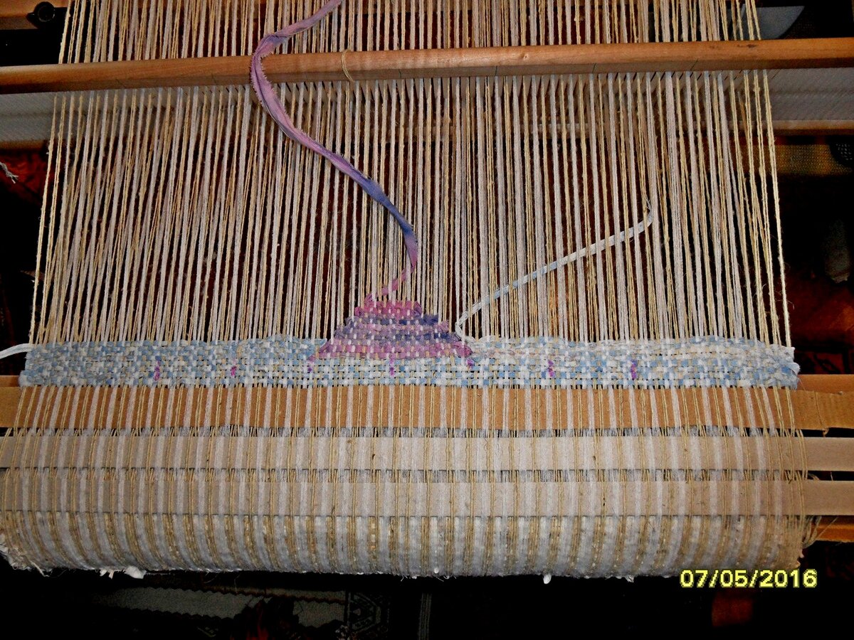Такой орнамент называют "пирогами", но у некоторых это "звездица". Понимаю, это странное название, логичнее бы сравнивать со звездой. В сообществе ткачей не раз обсуждали сравнение с пирогами, оставили так, типа "традицию сохраним". Дорожка 45х33 см. Полоса от постельного белья нарезана тонко — около 5 мм. Соткано на станке с бёрдышком в закладной технике. Основные нити — акриловые и шерстяные пряжа для вязания. (На самом деле профессиональные ткачихи ткут на прочной хлопковой нити для ткачества) После снятия со станка поняла свою ошибку — при дневном свете и в полумраке цвет орнамента сливается с основным и теряется. Тогда начала вышивать крючком по границе между фоном и орнаментом. Заодно скрыла огрехи в закладном ткачестве, которые делала от неопытности. Благодаря вышитому шву цвет орнамента стал ярче при любом освещении. Один из первых дорожек в этой технике. Это соткано 1 января 2016 года. Не очень понравилось, что концы узора какие-то кривые, не прямые из-за разной толщины у