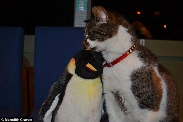 Мурка попыталась поднять пингвина, но тот от боли, так и не смог встать на лапку!