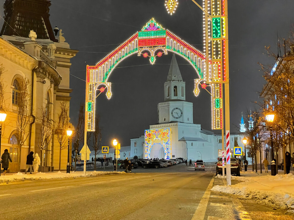 К казанскому Кремлю мы решили выйти по Кремлевской улице. Эта улица тоже неплохо украшена световыми порталами.