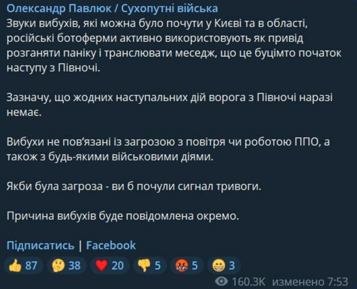 «Звуки взрывов, которые можно было услышать в Киеве и области, российские ботофермы активно используют как повод разгонять панику и транслировать месседж, что это якобы начало наступления с Севера. Отмечу, что никаких наступательных действий врага с Севера пока нет. Взрывы не связаны с угрозой с воздуха или работой ПВО, а также с какими-либо военными действиями. Если бы была угроза – вы бы услышали сигнал тревоги», – выступил с заявлением и заместитель командующего Сухопутными войсками ВСУ генерал-лейтенант Александр Павлюк. Даже глава Киевской ОВА Алексей Кулеба не стал поддерживать эту гениальную теорию и все же признал, что утром был поражен объект критической инфраструктуры. К слову, аналогичный объект был поражен также в Харькове. Ранее Readovka сообщала, что Украина может готовиться к применению химического оружия против российских войск.