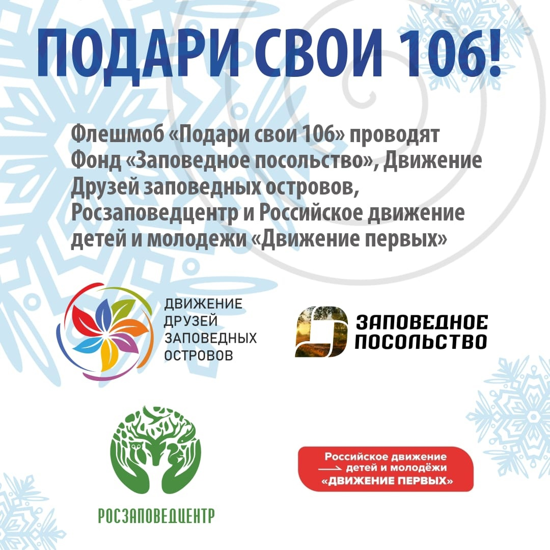 Я уже писал https://dzen.ru/a/Y76uManW5iZfbB02?share_to=link про суперакцию к 106-летию первого заповедника. Ну и, креатив пошел, пошел креатив: 1.Под девизом «Подари свои 106» я хочу посетить не менее 106 Заповедников нс территория нашего края и страны! (а ничего, что в России столько заповедников просто нет?) 2.106 стр обязуемся прочитать 3.Я присоединяюсь к флешмобу. Приглашаю на зимнюю прогулку в 10,6 километров, на которой загадаю загадаем 106 желаний или составим 106 обещаний беречь заповедные острова. Природа просто в восторге от этих подарков!!!