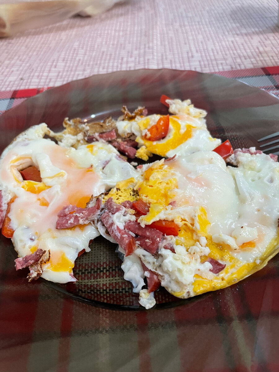Яичница с колбасой и болгарским перцем Во время еды употребляем 3 капсулы рыбьего жира Молоко 3% Запиваем молоком , желательно жирным. Едем дальше 💪
