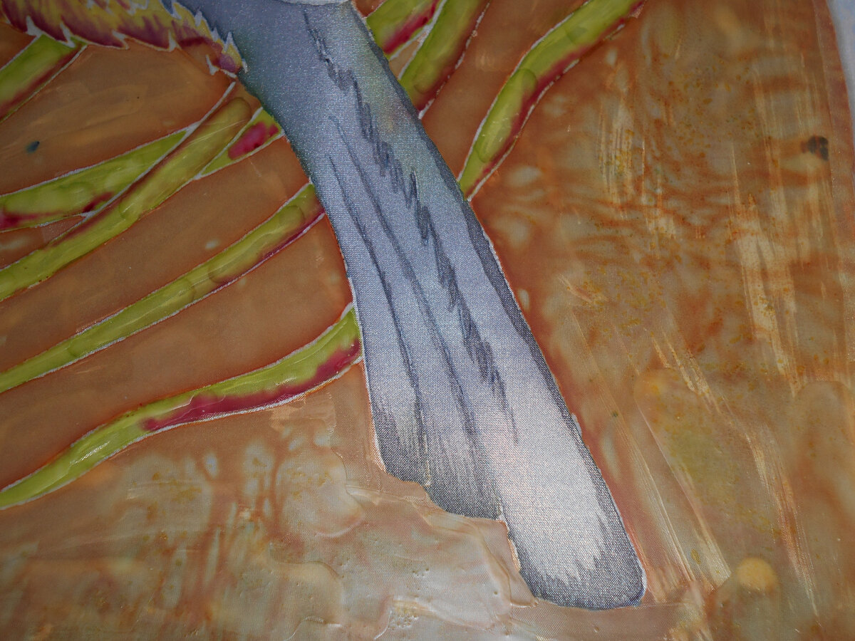Проделана очень интересная работа. Я вспомнила как работать с красками и вообще вспомнила как делать батик.)) Давно не занималась творчеством!)) Поняла, что надо организовывать место отдельное под творчество. Осталось подкупить недостающие краски и нормальный резервирующий состав. Рабочии раздвижные рамы сохранились в хорошем состоянии и это радует!)) Основная работа проделана на ура!)) Работа над картиной идёт к завершению. Наводим красоту на Тукана! Алгоритм действий такой-же - где посолили, где водичкой размыли... И получилась такая красота! С веткой вообще решила не заморачиваться, просто нанесла краску хаотично на оставшееся место.)) По моему, красиво получилось! Вот примерно так выгдядит общая картина. Это конечно, не окончательный вариант, надо ещё удалить воск с ткани. Но, это уже другая история.)) Всем хорошего настроения!