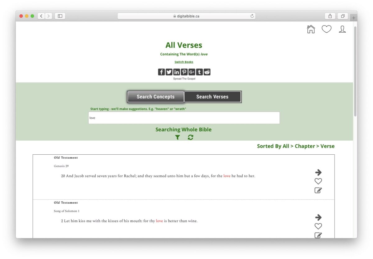 Сервис использует искусственный интеллект, чтобы найти в Библии стихи по ключевому слову или концепции. Например, можно напечатать «месть» или «Ной», и приложение отобразит все стихи из Библии, которые содержат упоминания слов. Сервис находит не только текстовые совпадения, но и смысловые. Сайт работает на английском языке. https://digitalbible.ca/